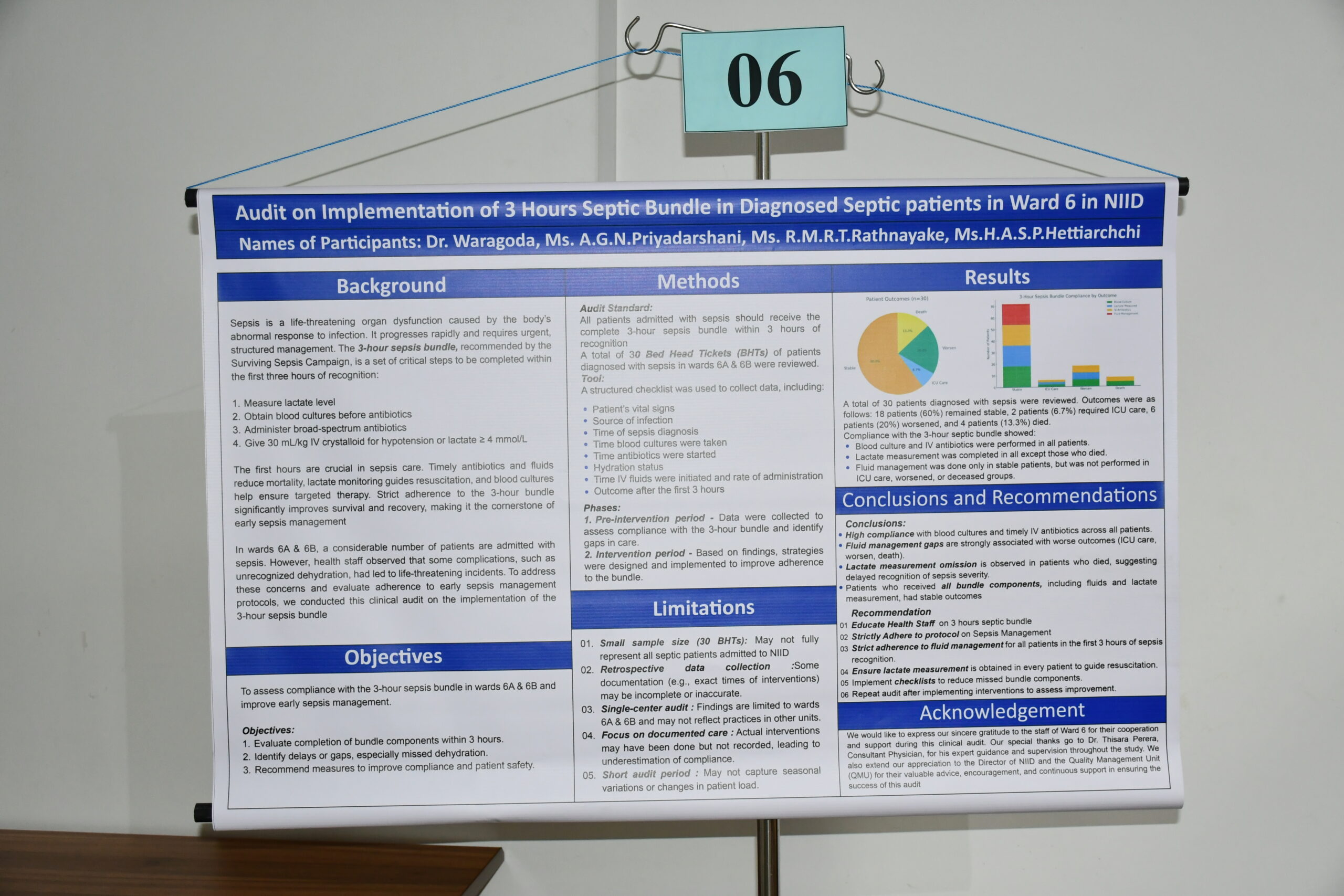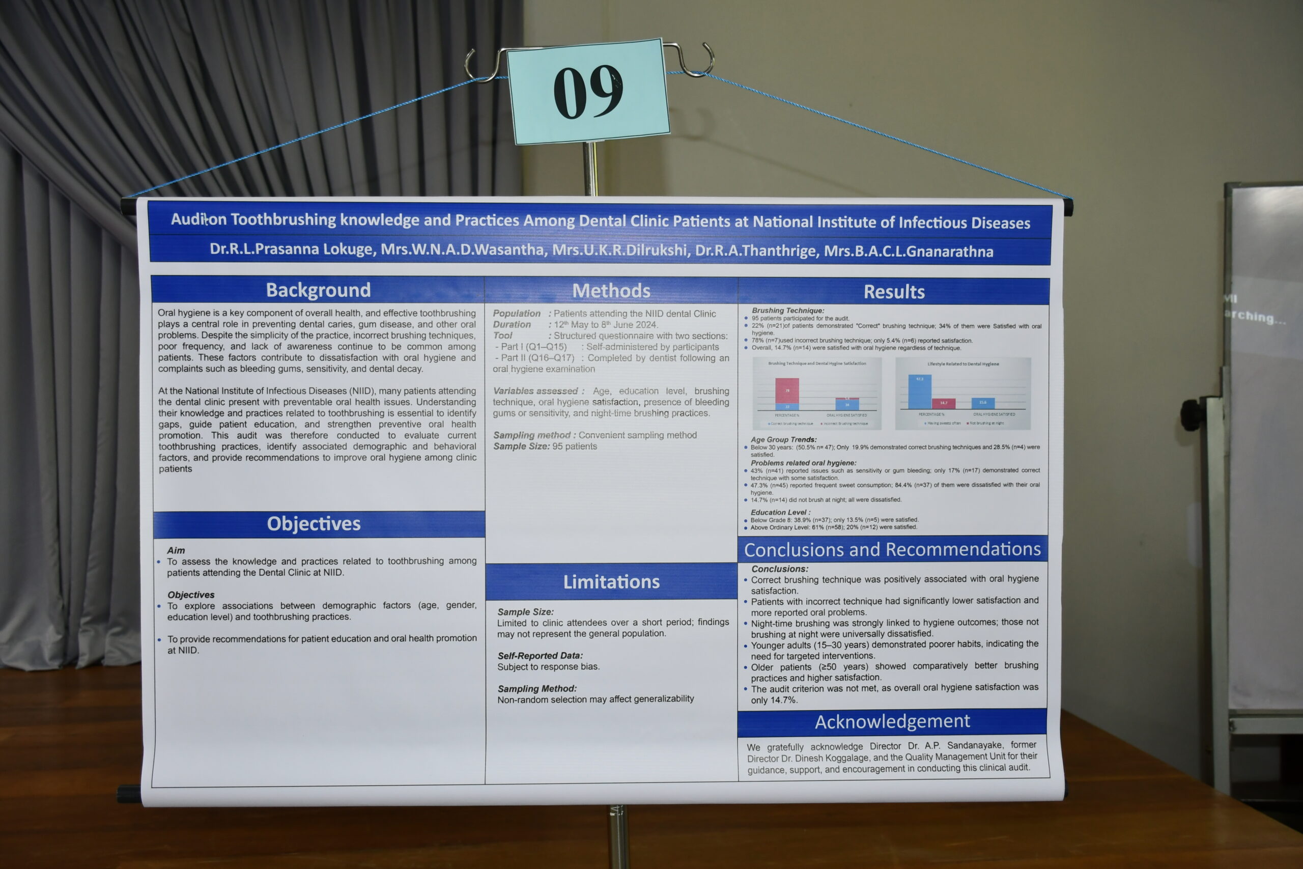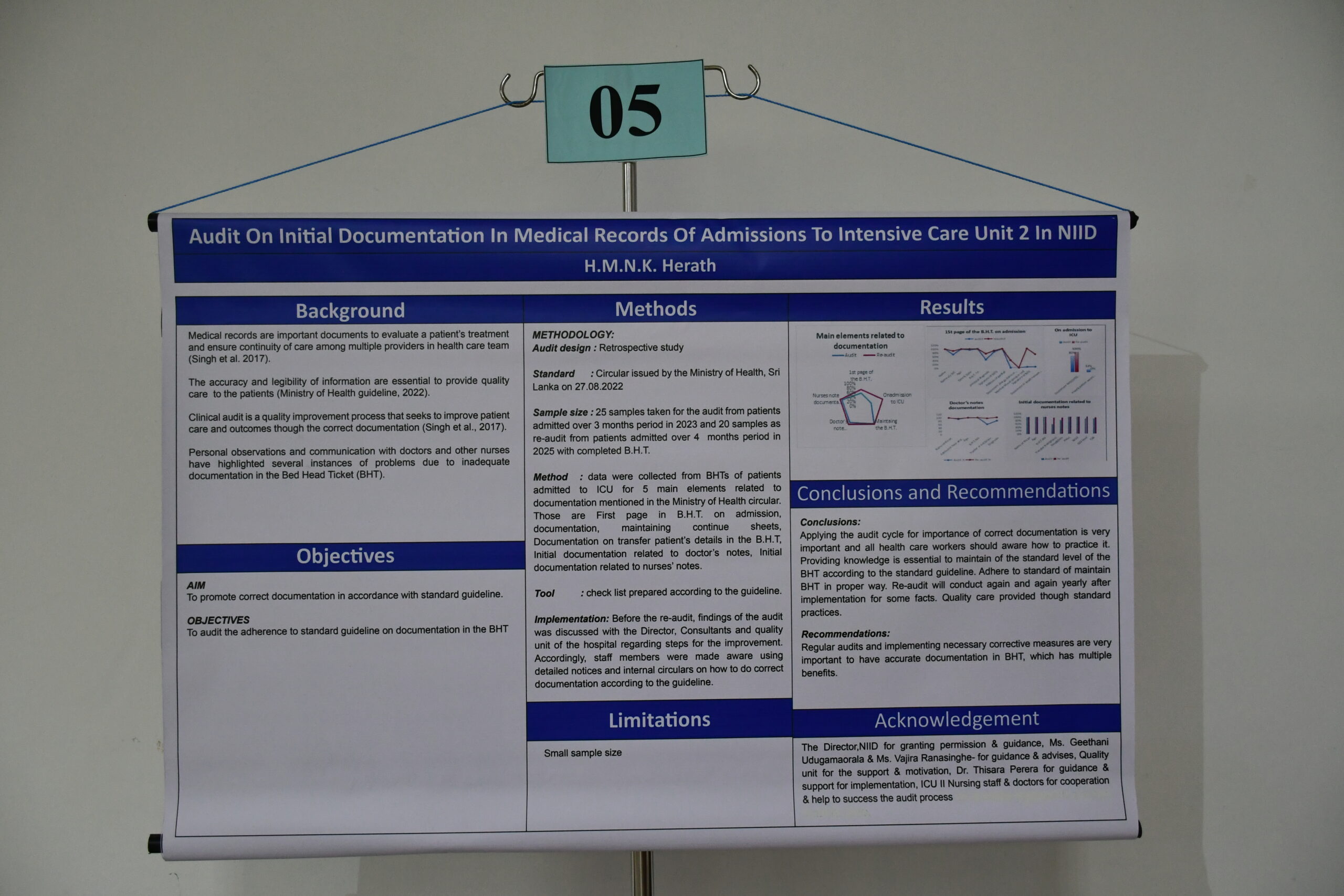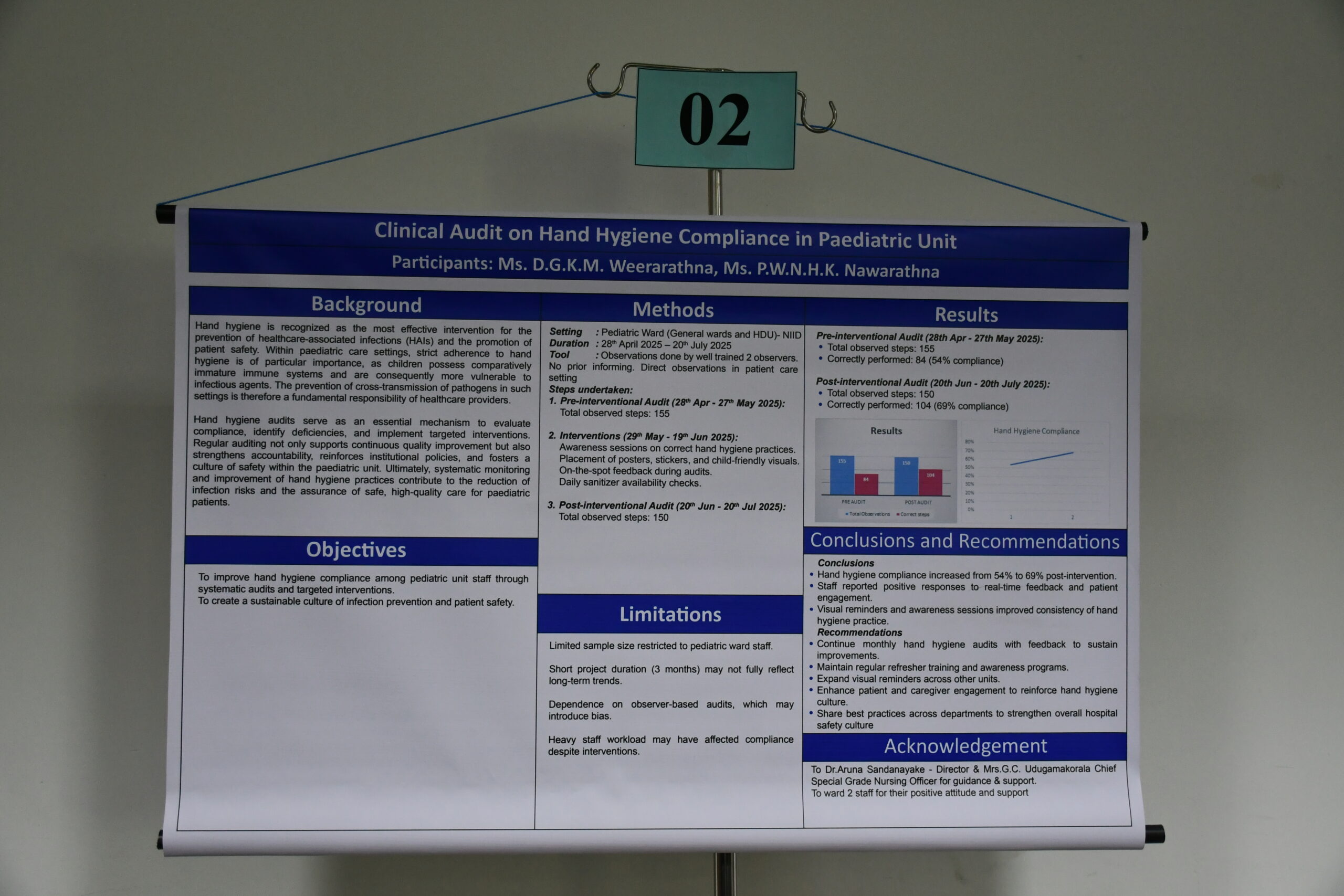 එක් එක් ඒකක වලින් සහභාගී වූ සෞඛ්ය කාර්යය මණ්ඩලයේ නිලධාරීන් රෝගීන්ගේ ආරක්ෂාව, සායනික කාර්යක්ෂමතාව සහ සෞඛ්ය සේවා ගුණාත්මකභාවය වැඩිදියුණු කිරීම කෙරෙහි අවධානය යොමු කරමින් Clinical Audit ව්යාපෘති ප්රදර්ශනය කළහ. සාක්ෂි මත පදනම් වූ භාවිතය සහ රෝගී ප්රතිඵල වැඩිදියුණු කිරීම සඳහා ආයතනයේ කැපවීම ඉදිරිපත් කිරීම් මගින් පිළිබිඹු විය.