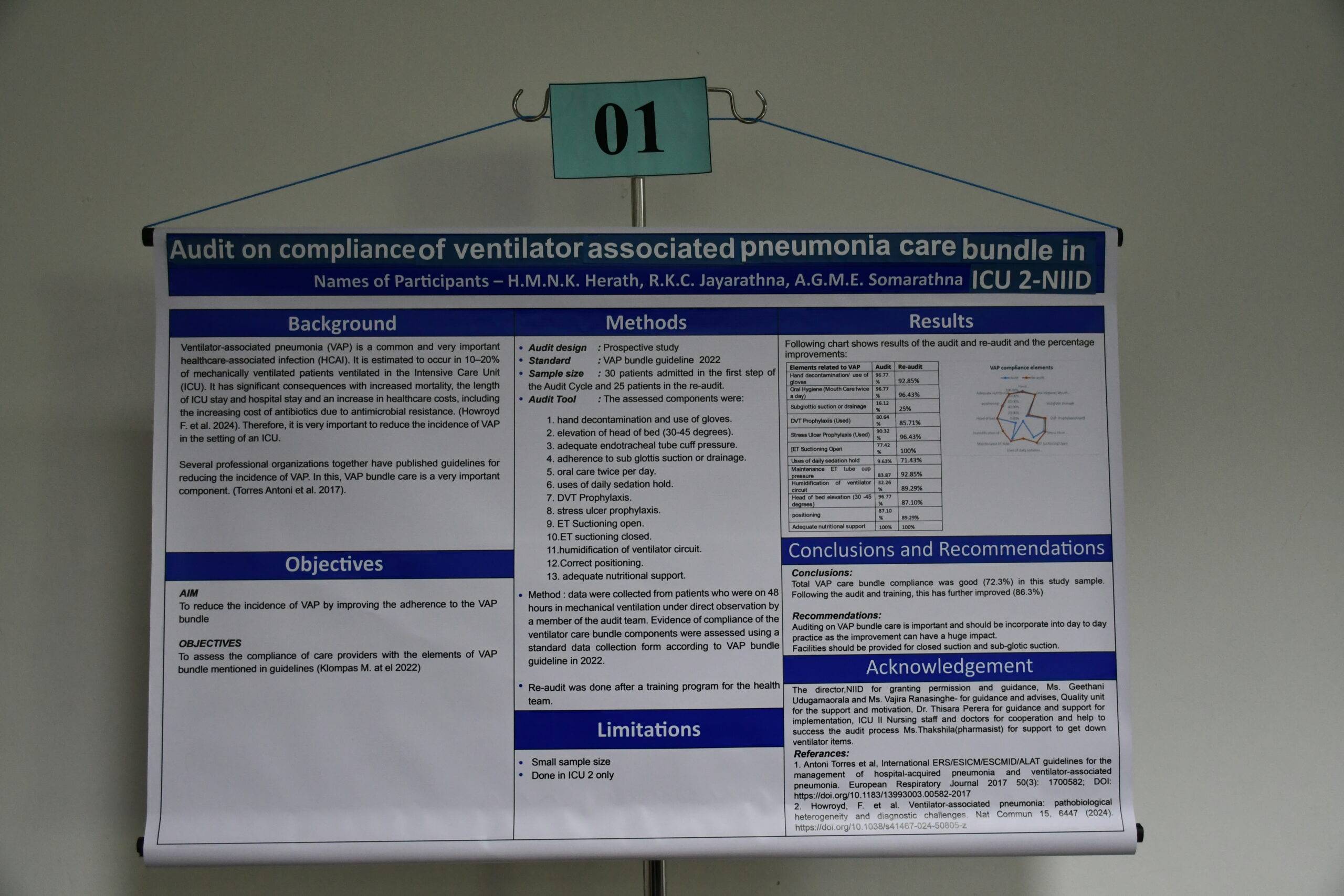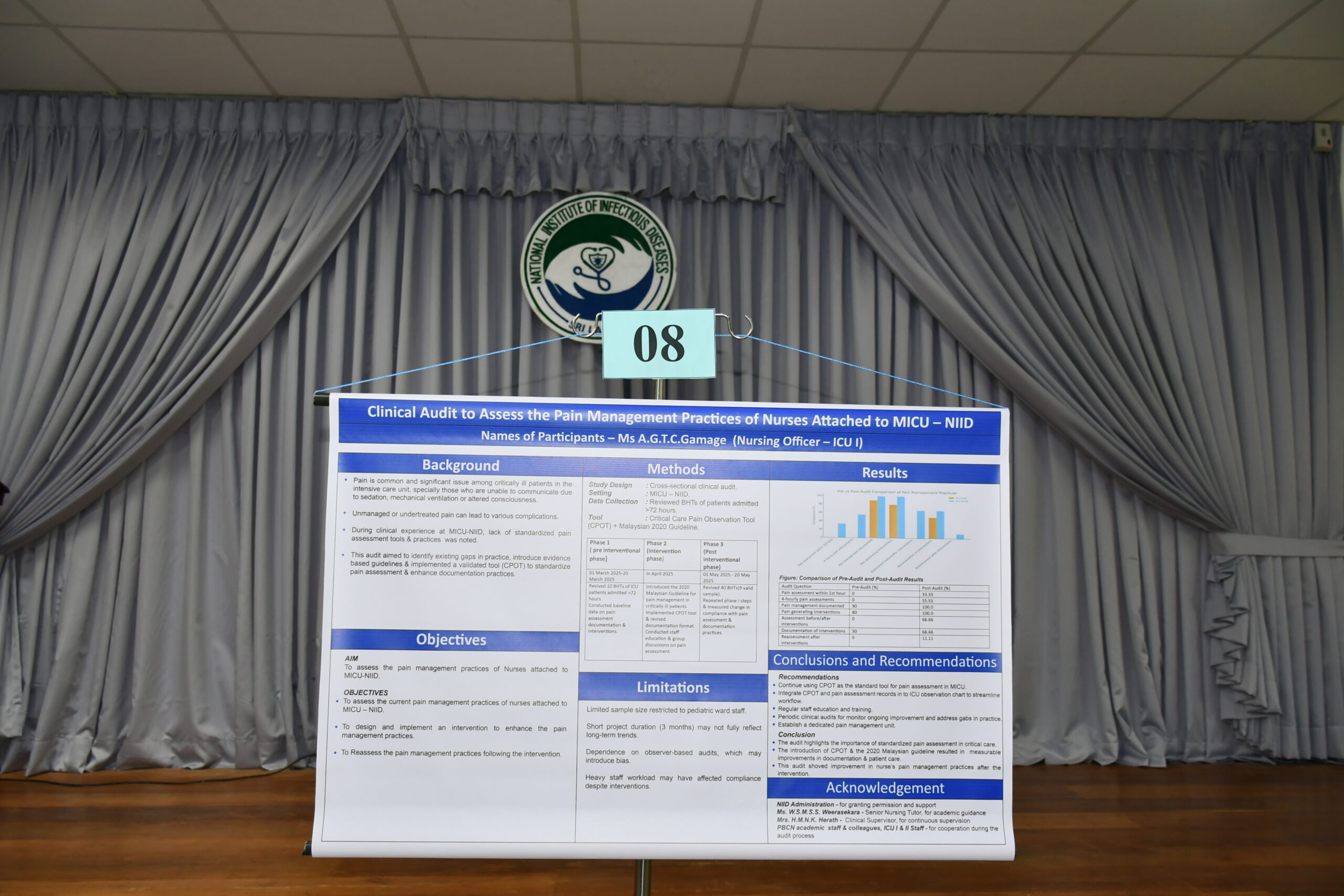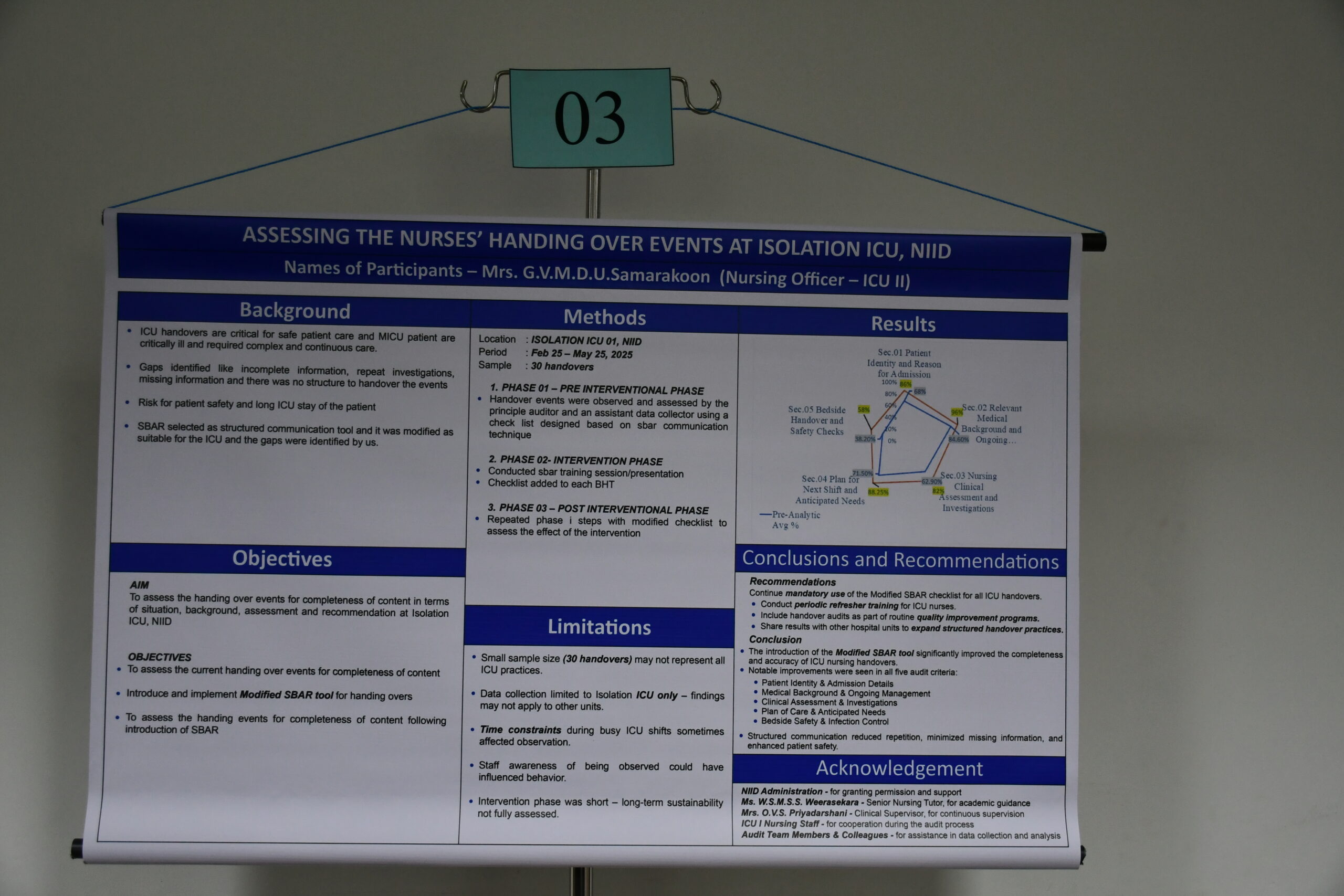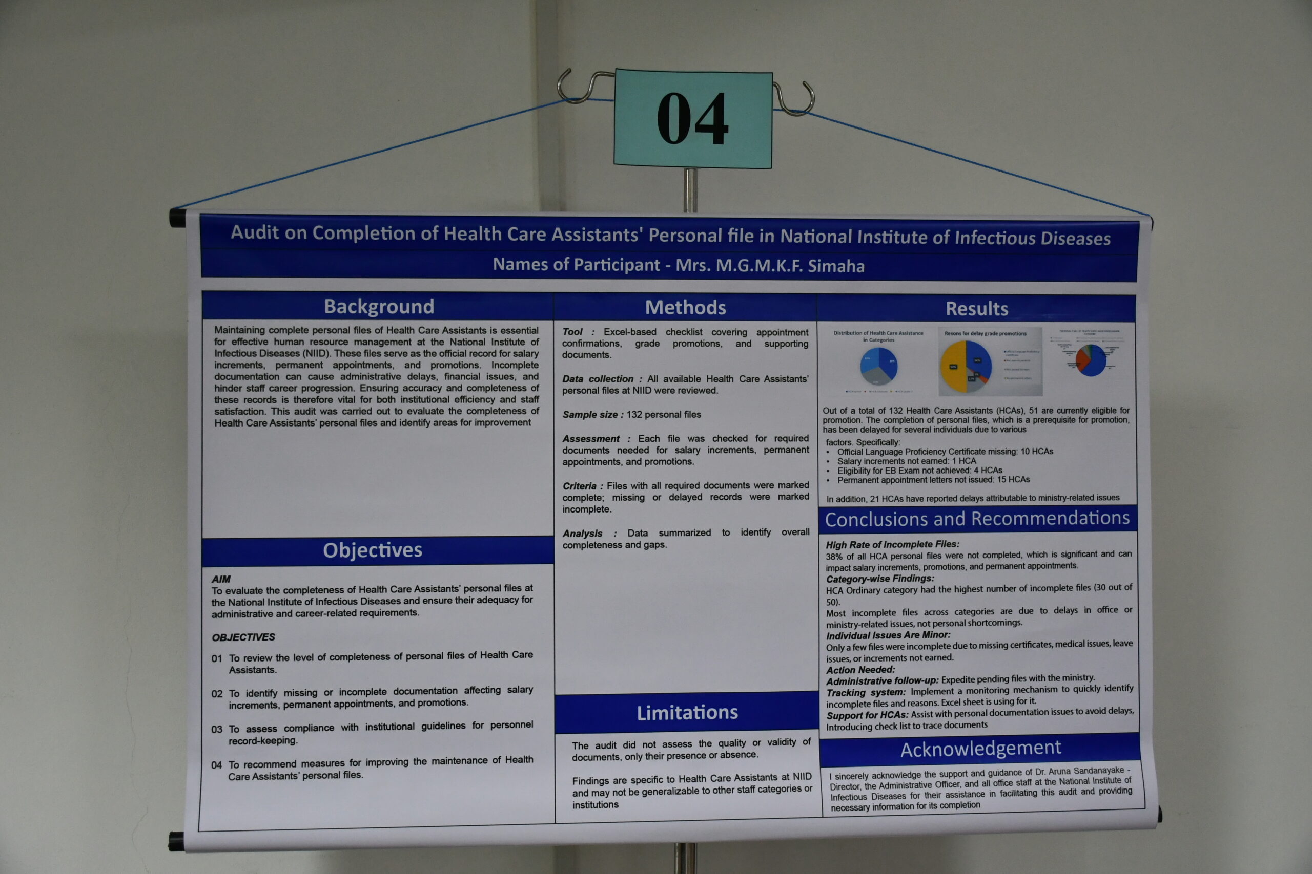එක් එක් ඒකක වලින් සහභාගී වූ සෞඛ්ය කාර්යය මණ්ඩලයේ නිලධාරීන් රෝගීන්ගේ ආරක්ෂාව, සායනික කාර්යක්ෂමතාව සහ සෞඛ්ය සේවා ගුණාත්මකභාවය වැඩිදියුණු කිරීම කෙරෙහි අවධානය යොමු කරමින් Clinical Audit ව්යාපෘති ප්රදර්ශනය කළහ. සාක්ෂි මත පදනම් වූ භාවිතය සහ රෝගී ප්රතිඵල වැඩිදියුණු කිරීම සඳහා ආයතනයේ කැපවීම ඉදිරිපත් කිරීම් මගින් පිළිබිඹු විය.