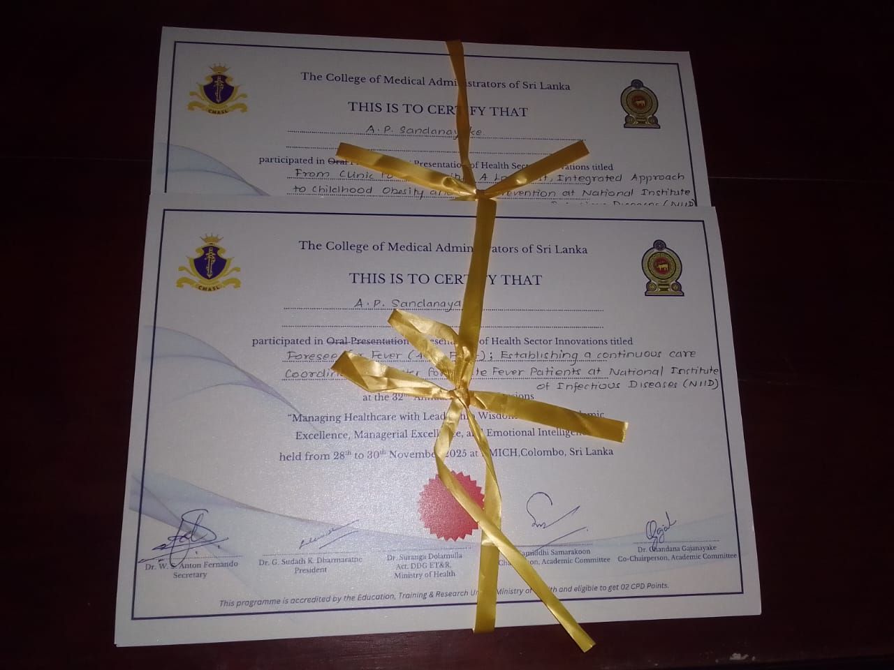 - සහභාගීත්ව සහතිකය තේමාව: "සායනයේ සිට ප්රජාව වෙත: ළමා තරබාරුකම සහ බෝ නොවන රෝග (NCD) වැළැක්වීම සඳහා අඩු පිරිවැය සහිත ඒකාබද්ධ ප්රවේශයක්" (“From Clinic to Community: A Low-Cost, Integrated Approach to Childhood Obesity and NCD Prevention at NIID”) කතුවරුන්: මල්වත්ත A., සඳනායක A.P., සෙනරත්න Y.H.D., පෙරේරා W.I.B., මධුවන්ති G.D.G., පන්නිලගේ R.A.